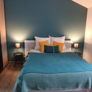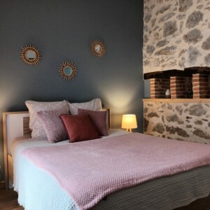 Dans la suite au rez de chaussée, vous trouverez une chambre décorée avec un joli mur de pierre, un lit de 140 pourvu d’une bonne literie, ainsi qu’une petite commode pour ranger vos effets personnels, la salle de bain et les toilettes sont attenantes à cette chambre et sont aménagées pour personnes à mobilité réduite.