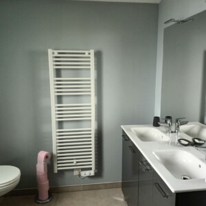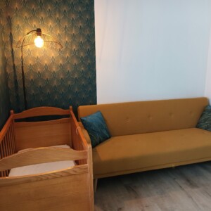 La deuxième chambre à l’étage est composée d’un lit de 140, d’un clic clac laissant la possibilité de coucher deux enfants et d’un petit lit de bébé. Elle possède également sa salle de bain et ses toilettes. Nous vous mettons également à disposition une chaise haute. Si toutefois, vous aviez besoin d’autre chose, n’hésitez pas à nous le faire savoir.