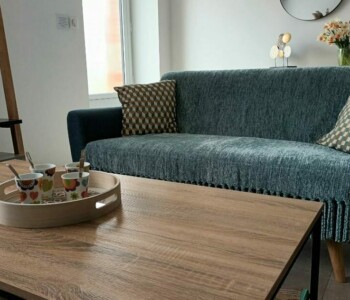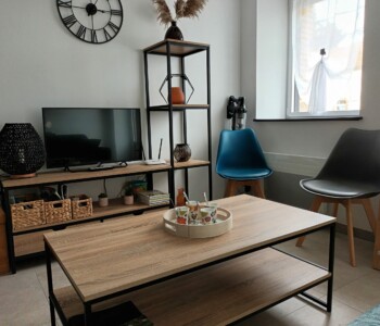 Le coin salon est composé d’un canapé 3 places et d’un fauteuil. Ainsi après une longue journée de visites, vous pourrez vous y réunir autour d’un bon verre de vin ou de jus de pommes (produit local). Vous trouverez également une télévision pour les soirées plus maussades.